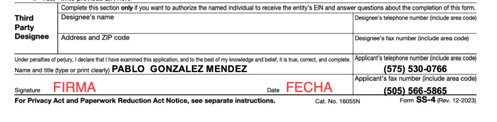 Dentro del portal documental, encontrarás dos archivos titulados «SOLICITUD EIN» y «SOLICITUD 8821» respectivamente. Es importante que lo firmes y nos lo envíes de vuelta lo antes posible para que podamos gestionar tu EIN. Al firmar el formulario SS4 y el 8821, recuerda: